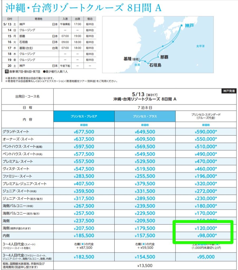 こちらは、ダイヤモンドプリンセスの2023年5月13日出発の「沖縄・台湾リゾートクルーズ8日間A」わたしが勤めていた会社で販売していたときも毎年とても人気のコースです。