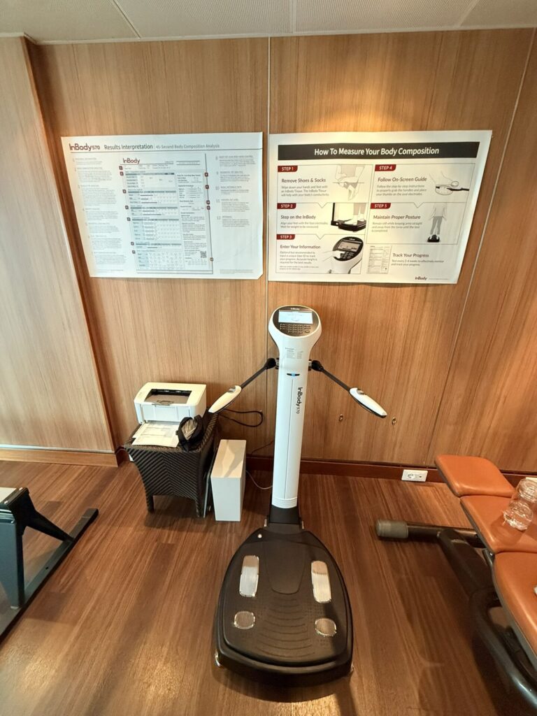 ジムも基本的な設備は充実しています。体組成計が無料で使えるもの嬉しいところ。重量がすべてポンド表記になっていますが、壁にキログラムへの変換表が書かれており、一度利用すれば慣れると思います。