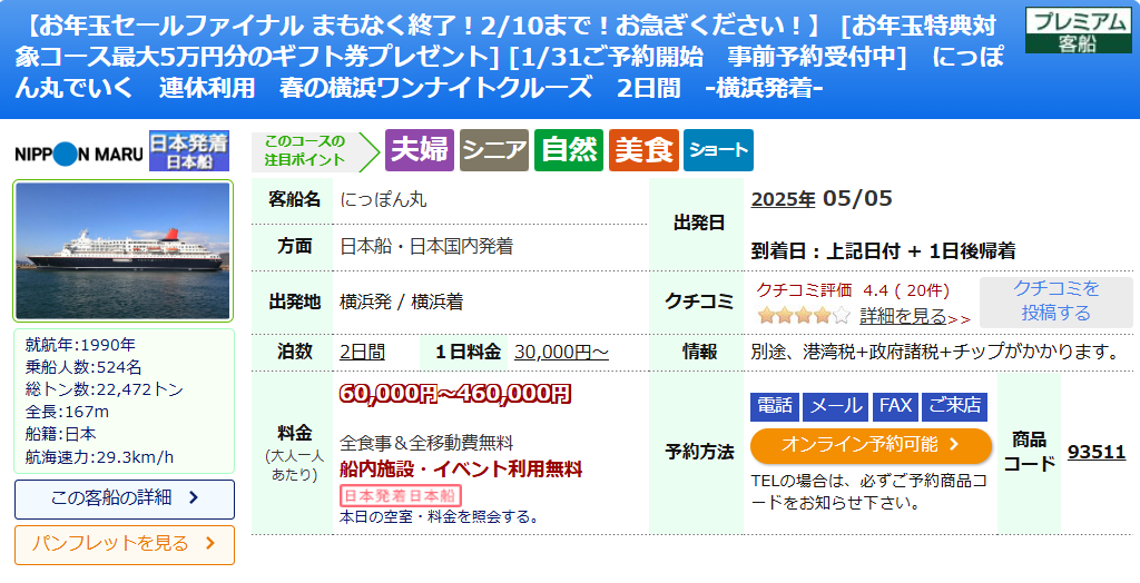 出発日 | 日数 | 船 | 商品 | 出発港 | 最低料金 | 詳細サイト |