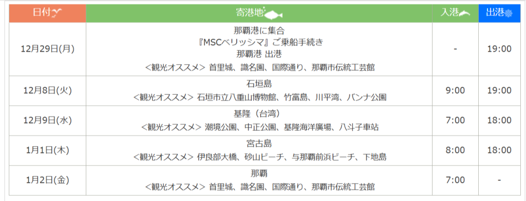 2025/12/21 | 5 | MSCベリッシマ | 那覇・石垣島・基隆クルーズ | 那覇 | 66,800 | 詳細 |