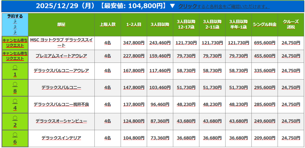 このように、船会社から旅行代理店に対して旅行代金ごとに卸されるため、基本料金は統一されています。(ただし、高く販売することは可能)