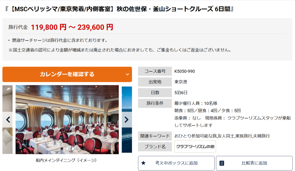 参考までに、阪急交通社が販売する2025年10月20日出発のMSCベリッシマ(九州・韓国・釜山クルーズ6日間・内側客室) を他の旅行会社と比較してみます。