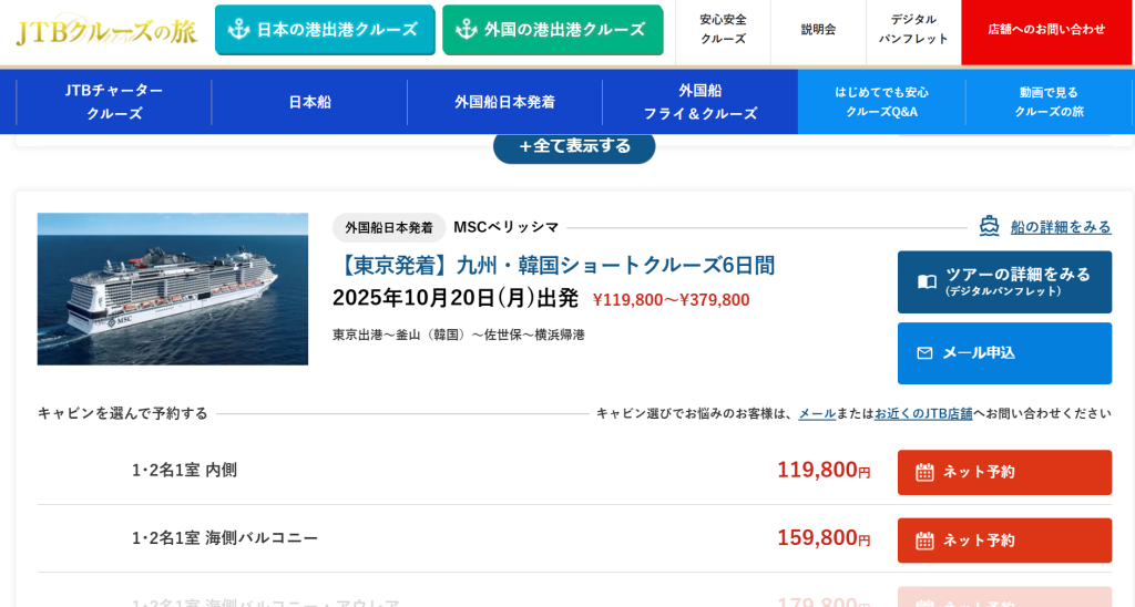 2025/10/20 | 6 | MSCベリッシマ | 佐世保・韓国釜山ショートクルーズ | 東京 | 119,800 | 詳細 |