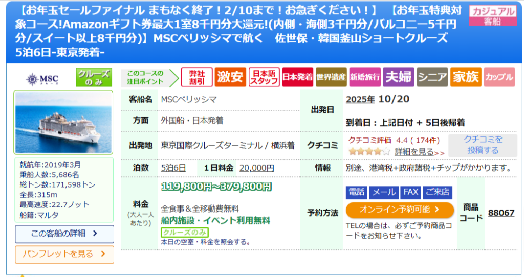 2026/01/19 | 5 | MSCベリッシマ | 那覇・石垣島・基隆・東京クルーズ | 那覇 | 55,980 | 詳細 |