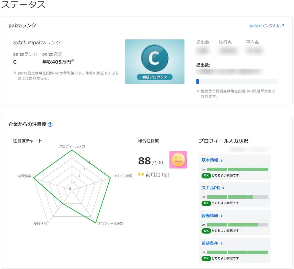こちらは実際にpaizaに登録をしていた過去の自分のステータスです。