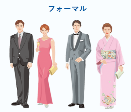 ✔ 女性:イブニングドレス、カクテルドレス、和装(着物)