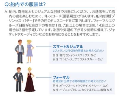 という感じで、あらかじめ決まっています。例えば、下の画像は、ダイヤモンド・プリンセス日本発着クルーズのデジタルパンフレットに記載がある船内の服装のイラスト画像です。