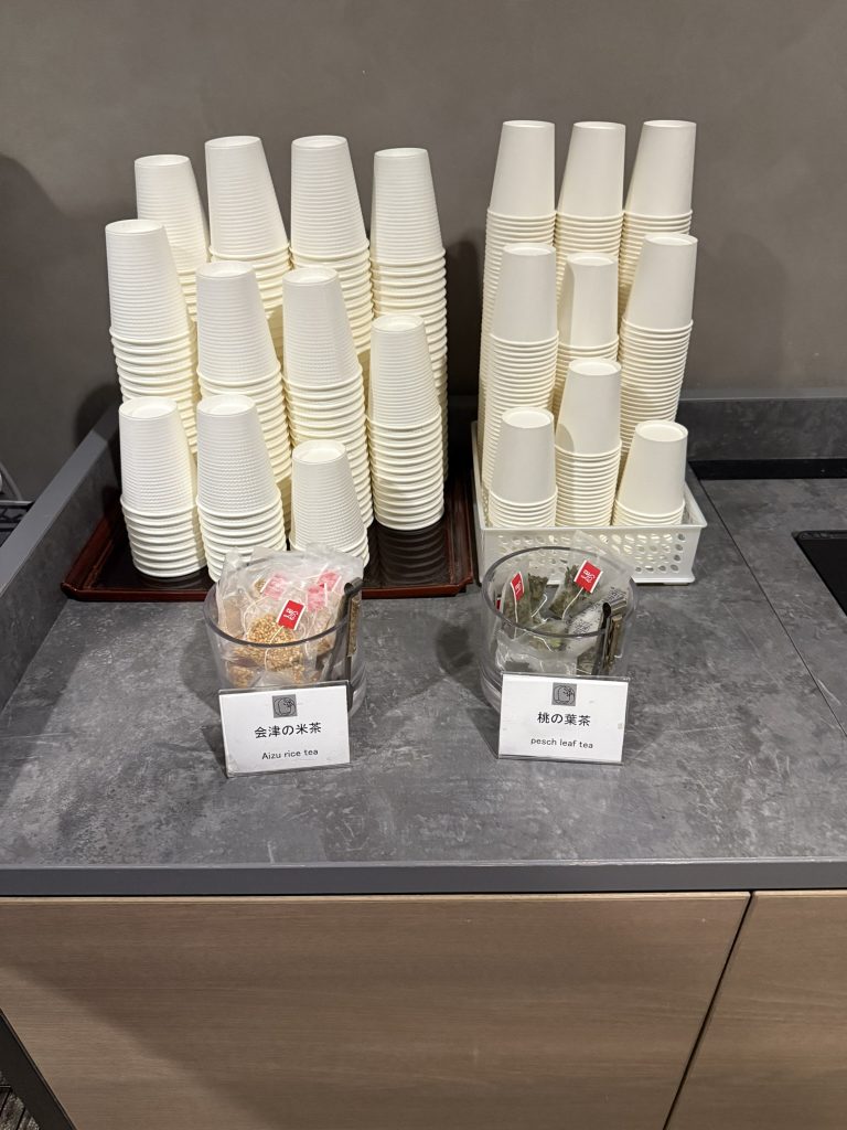 - 大浴場前のラウンジもオシャレで落ち着いた雰囲気。会津の米茶や桃の麦茶などの郷土のお茶も楽しめる。